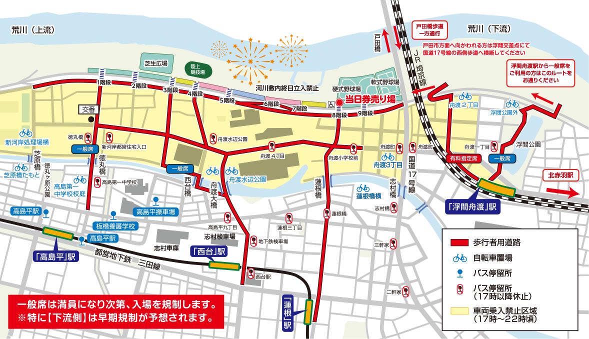 - ●「14~17エリア」「硬式野球場」「軟式野球場」付近で観覧予定の方は 最寄り駅のJR「浮間舟渡駅」 が大変混雑いたします。都営三田線「蓮根駅」をご利用ください。