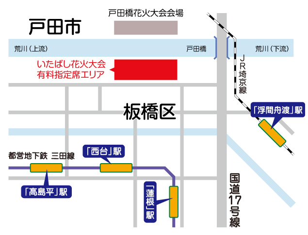 「いたばし花火大会」の会場は荒川南岸(東京都板橋区・都営三田線側)です。