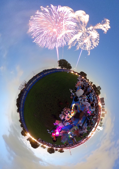 約180度ほどの画角を持つ、いわゆる魚眼レンズによる画像はみなさんご覧になったことがあるでしょう。この作品は、上下左右全方位の360度パノラマ写真が撮れる「全天球カメラ」によって撮影されたものです。青い宇宙にぽっかりと浮いた、いたばし花火大会という小さな惑星とそこから打ち上げられた巨大な花火。陸上競技場の木々と芝生が、地球を緑の惑星に演出してくれました。ぜひ拡大してご覧いただきたいと思います。初めての視覚にしていきなりの大傑作の登場です。