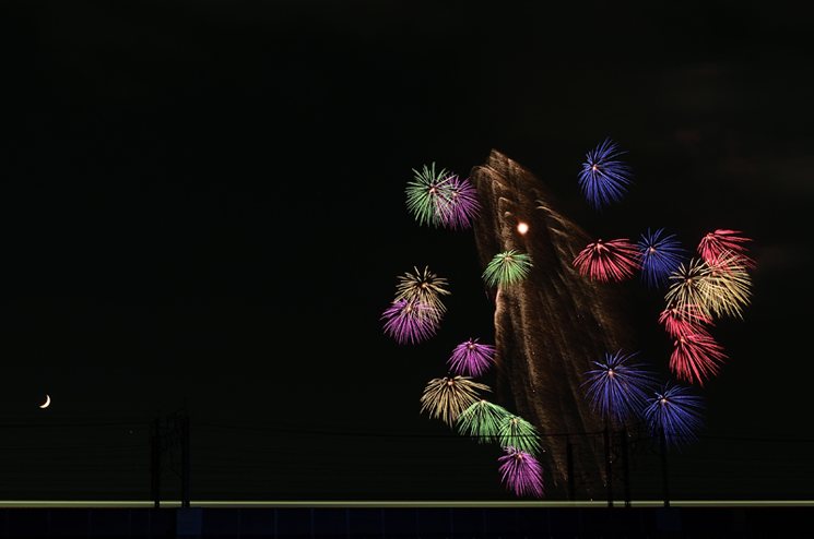 このところ撮影場所を定めて花火写真の表現に挑戦し続けている福島さんの、一つの頂点とも言える作品が誕生しました。戸田橋を渡る列車が描く、一直線に伸びた蛍光色のラインの上にはカラフルかつ露出を引き締めた花火、そして絵に描いたような三日月。この静謐にして大胆な構図は、もはや写真であることを超えた存在のようです。福島さんのイマジネーションが向かう先には何が待っているのでしょうか。