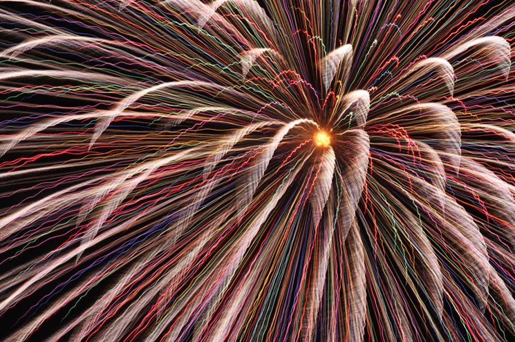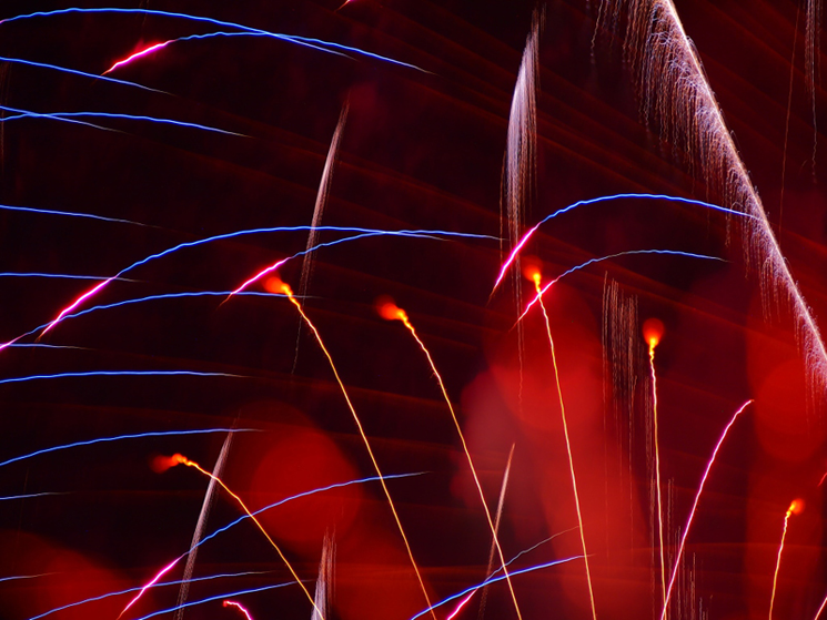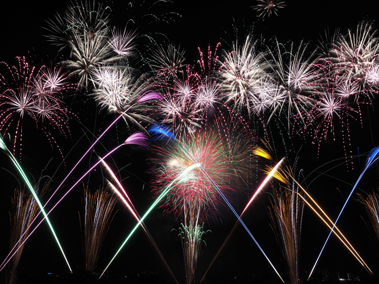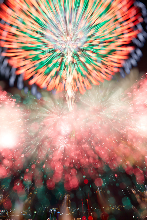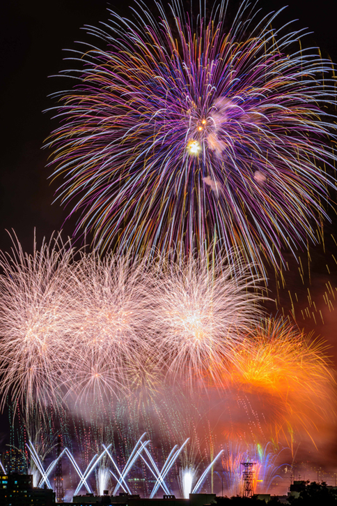 望遠レンズによる花火のクローズアップ撮影も毎年多数の作品を応募いただく人気のコンテンツですが、この一作は顕微鏡的なまでの繊細な表現力とほとばしるエネルギー感が抜きんでています。シャッタースピード、絞りの選択が見事に決まって、色とりどりのウェーブを描く光跡の一本一本が生命力を持って描写されています。24色の色鉛筆のような、カラフルなパレットのような充実度と立体感の一大シンフォニーです。ぜひ拡大してお楽しみください。