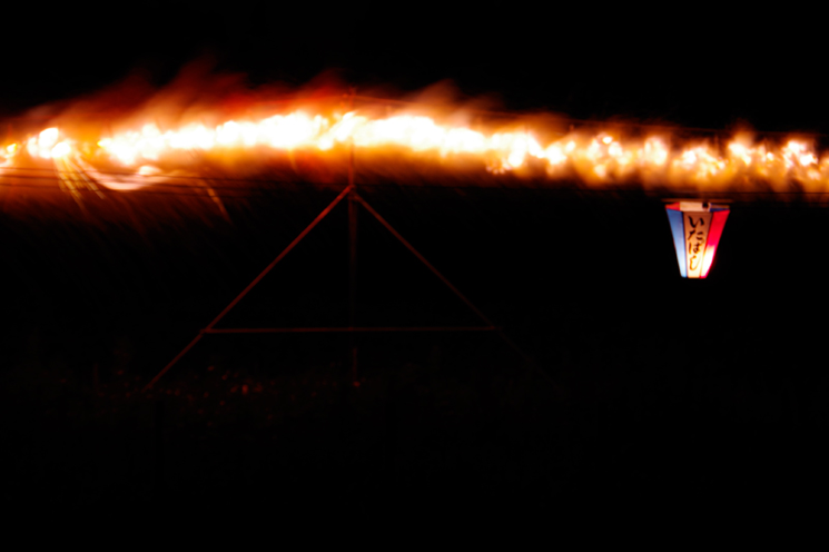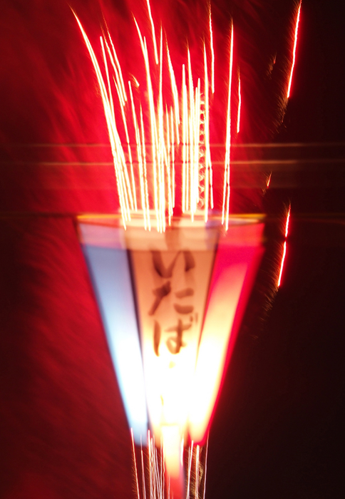 真っ先に入賞が決定した作品の一つ。ナイアガラの滝に点火した直後、一瞬にして炎が走り広がってゆく、その瞬間を見事に捉えました。強いコントラストによって作り出された漆黒を背景に、天を駆ける龍の生命力を力強く描いています。炎龍の疾駆を導くかのような提灯のワンポイントが実に効果的で、モノトーンの画面に一点だけ配した原色が全体を引き締めており、静の提灯が動の炎との対比を高めています。今まさに画面を駆けぬけんとする龍の髭が心ニクイ演出を見せてくれます。