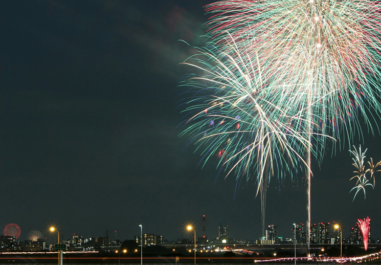 が、実は、さらにもう一つの花火大会が共演に加わっていることに皆さんお気づきでしょうか?画面の左下、赤と金色の大きな花火が上がっているのは江戸川花火大会の8号玉でしょう。直線距離にして約24kmを隔てたこの共演者に、より大きな役が与えられた姿も見てみたいものです。