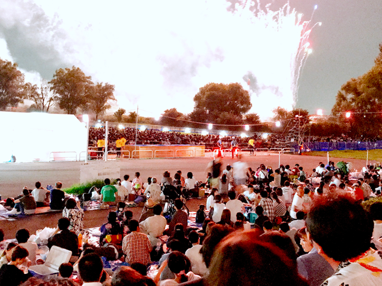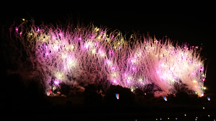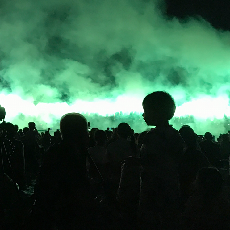 花火の光を受けてオレンジ色に輝く煙が、紺色の空とグリーンの明かりに浮かび上がる建物を分かち、画面を引き締めています。