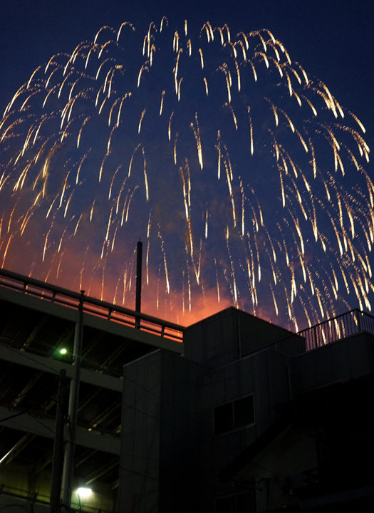 ちょうど避雷針が傘の柄になり、本当に大きな雨傘を開いたかのように見えます。手前に建物を写し込んでいるため花火の大きさが際立って、傘に覆われた空のスケール感までを演出しています。工場(倉庫?)の建物と花火の取り合わせは、板橋の景観を代表する一つでしょう。