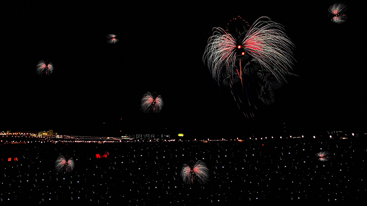 これまでも創造性豊かな作風と高度な技法でいたばし花火を捉えて来た福島さんは、ついに絵画の領域に足を踏み込んだと言えそうです。観客席のスマホ画面を散りばめたお花畑とその上を乱舞する蝶々たち。これからもいたばし花火をあっと驚く仕立てで再構築して我々を楽しませてください。