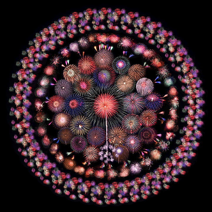 こちらもまた驚きの一作。いたばし花火で打ち上げた花火を一つ一つ丁寧に配置して、万華鏡を覗き込んだイメージを表現しました。拡大してよーく見てみると、それぞれの花火の表情の違いが手織りのタペストリーのような魅力を生んでいます。
