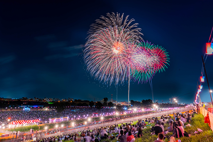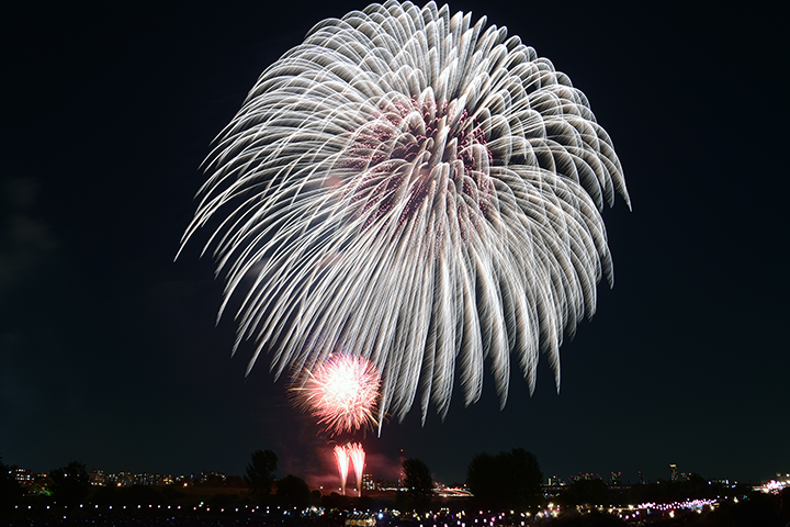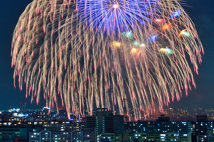 本当に天まで届いているかのような、空と観客席とを埋め尽くす大玉の輝きです。観客席の明かりのみならず遠くのビルやマンションも取り入れることで、文字通り大花火のスケール感が一層増しています。