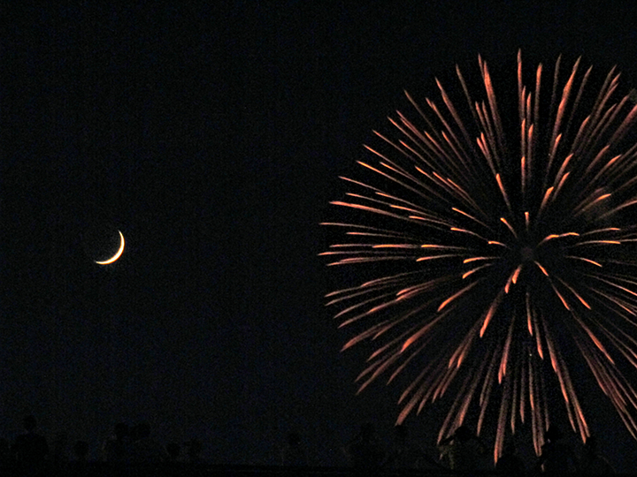 今年のシンプル大賞、抽象化番長はこの作品。あの夜、特徴的な三日月を作品に取り込んだ方は大勢いらっしゃいましたが、ここまで明確にテーマを絞ったことが受賞の要因でしょう。和火のような渋い単色の花火との共演が、最高に決まっています。