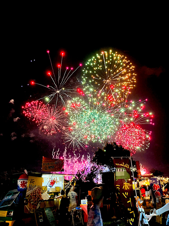 フードトラックマーケットの灯りやのぼり旗が極彩色の花火と相まって、