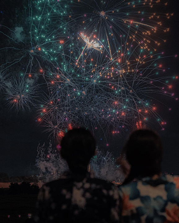 朧げな二人のシルエット、繊細な軌跡で張り巡らされた、満天の星空のような花火。