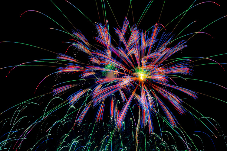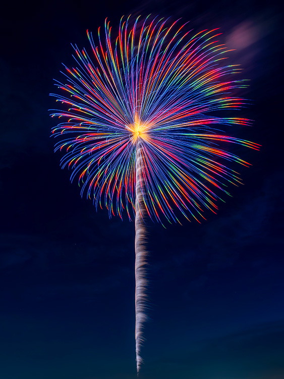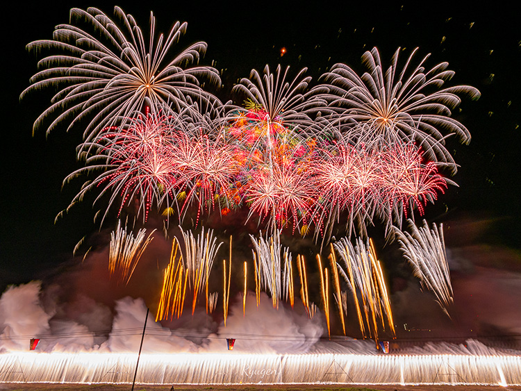 まるで扇風機のように、渦を巻いて回転しているかに見えるミラクルな花火は芸術玉の一発。今年はこの花火をクローズアップした作品が多く寄せられましたが、中でも群を抜いて完成度が高く美しい作品となりました。