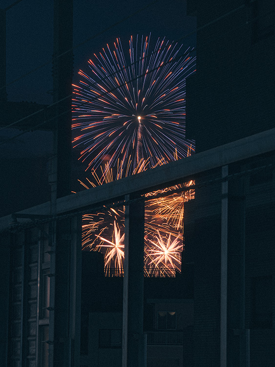 高架を走る都営三田線の線路は、高島平周辺の街の景観を特徴づける大きな要素の一つですね。そんな線路越し、ビルの間から見える花火には “ぜんぶ見えないからこそ” の魅力が溢れています。