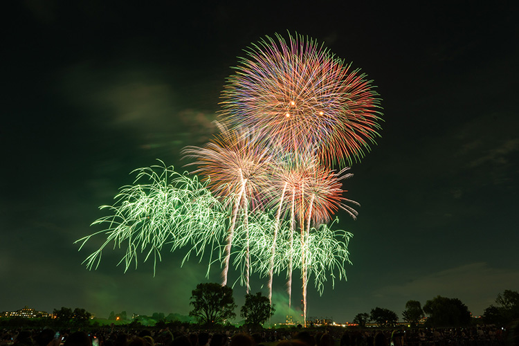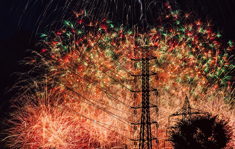 会場周辺を通る高圧線の鉄塔もまた、いたばし花火の風景の一部。はじけるキャンディのような画面いっぱいの花火に力強い鉄塔のシルエットが組み合わさせて、迫力ある画面が完成するのですね。