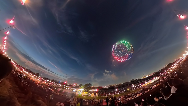 360°撮影できる全天球カメラによる画像を魚眼レンズ風に切り出した作品。会場の上流側から下流側まで、丸ごとの観客席の前にぽっかりと浮かぶ花火。円で構成された画面の面白さに見入ってしまいます。