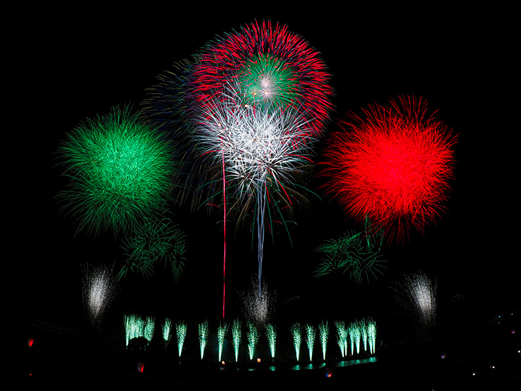 イタリア・ボローニャ市と板橋区の友好協定20周年を祝って打ち上げた「トリコローレスターマイン」。イタリア大使館からのお客様も、観客席の皆さまも、改めてさらなる友好の想いを心に抱いたことでしょう。大会にとっても素晴らしい思い出となった記念碑的な一枚です。